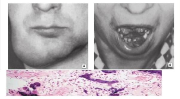 Макропрепарат :класична (внутрішньокісткова) остеосаркома нижньої щелепи. Щелепа деформована розростяннями пухлиної тканини. Зуби в межах опухолі выдвинут, рухомі, їх корені піддалися резорбції.
