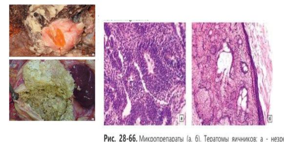 Мікропрепарат:виділяються диференційовані тканини всіх трьох зародкових листків (мезодерми,ентодерми,ектодерми). Також представлено фрагменти хрящя,жирової тканини,є включення шлункових залоз та фолікул щитовидної залози. Така особлива форма називаєтьсяструм яєчника.