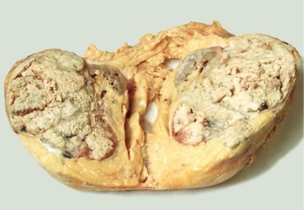 Макропрепарат: на розрізі видно великий пухлинний вузол з ділянками некрозу, чітко відмежований від ниркової паренхіми.