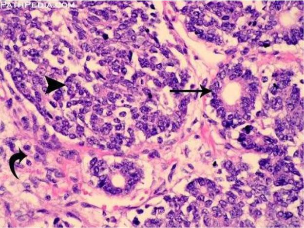 Мікропрепарат. Нефробластома (пухлина Вільмса). Пухлина представлена дрібними округлими і овальними недиференційованими клітинами з гіперхромними ядрами, вузькою цитоплазмою. Формуються трубчасті утворення, що нагадують ниркові канальці . Строма пухлини складається з колагенових волокон і фібробластів. Видно гангліозних клітини