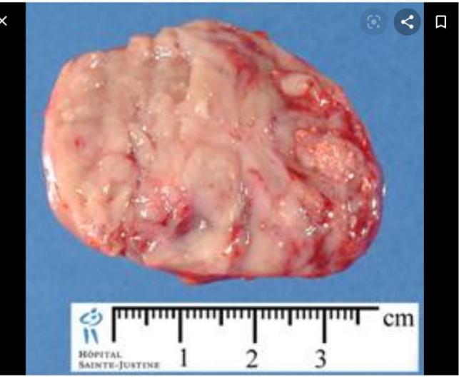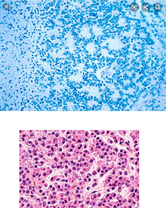 Мікропрепарат: Пухлина складається з солідних полів дрібних круглих або злегка овальних мономорфних клітин з вузьким обідком цитоплазми, клітинна маса розділена на нерівномірні поля вузькими сполучнотканинними прошарками, видно значну кількість судин. В осередках некрозу життєздатні пухлинні клітини іноді формують периваскулярні муфти.