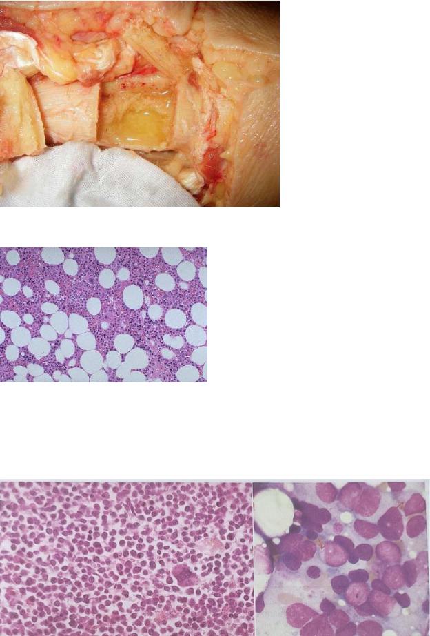 Макропрепарат. Кістковий мозок діафіза стегнової кістки при апластичній анемії. Кістковий мозок стегнової кістки жовтого кольору (без вогнищ кровотворення)