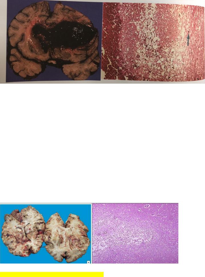 МІКРО: Спостерігається великих розмірів зона некрозу з великою к-тю в ній макрофагів («зернисті шари») і формування «псевдо кісти». В тканинні що збереглися видимі повнокровні Судини мікроциркуляторного русла. Загиблі нейрони і нейрогліальні клітини, нейтрофільна і нфільтрація.
