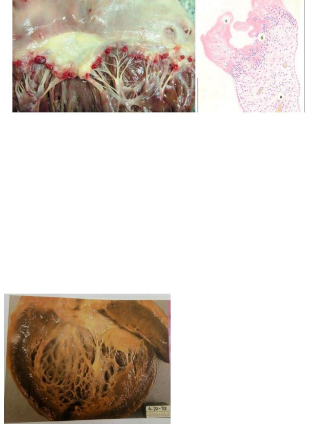 Макро : Розміри і маса серця не змінені, стулки мітрального клапану помірно потовщені, набряклі, з мілкими темно-червоного кольору, тьмяними тромботчними нашаруваннями (у вигляді бородавок), що легко відділяються та кришаться, по вільному краю (в осередках пошкодження ендотелію)