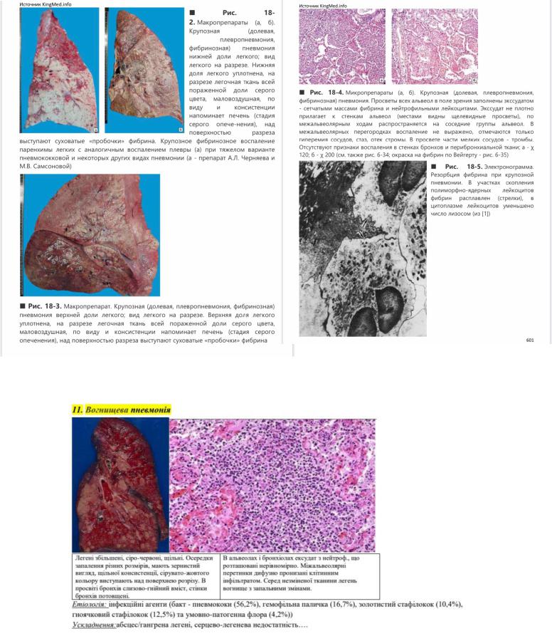 Стадія сірого опеченения. Пошкоджена частина збільшена, щільна, важка, на плеврі значні фібринозні плівки, з зернистою поверхні зрізу стікає каламутна рідина. Запалення займає весь гістологічний зріз тканини легені. Просвіт альвеоли заповнений ексудатом.