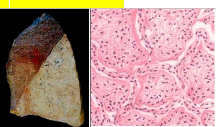 альвеоли заповнений ексудатом. Нитки фібрину проникають через |