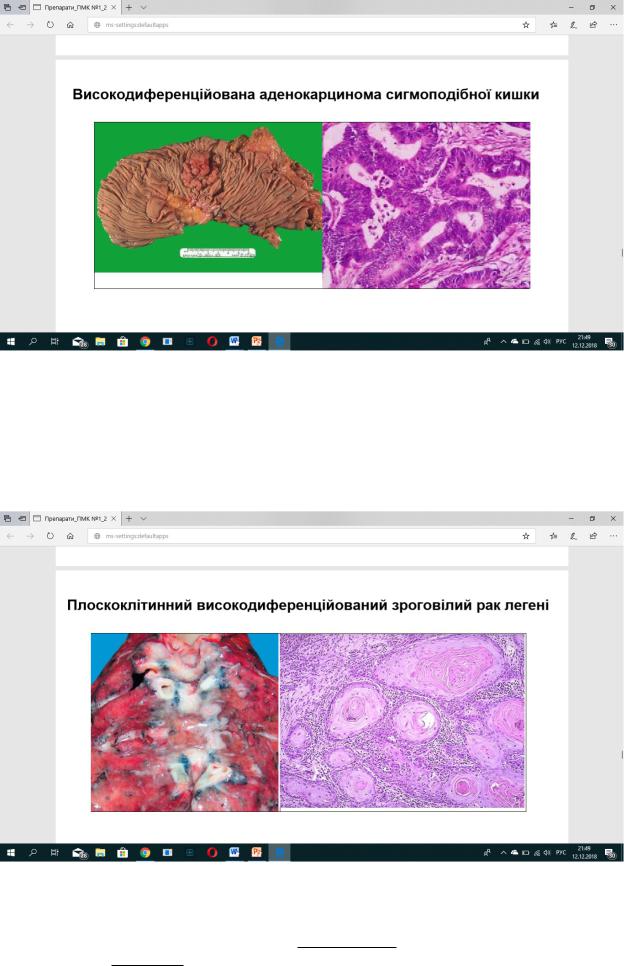 Мак.: плоско клітинна карцинома(рак) - пухл. сіро-білого кольору, тканина без чітких меж, щільної консистенції, запалення легень навколо пухлини.