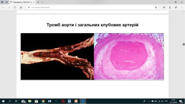 Мак.: орган збільшений, має білий колір, поверхня не щільна, бліда, наявні обтуровані ділянки. Мік.: стінка судини стоншена , та у вигляді щільних мас тромби обтурують просвіт аорти, Причини: судина з атеросклерозом, прикріплення до стінки Наслідки: пошкодження аорти (атеросклероз, аортит, травма)