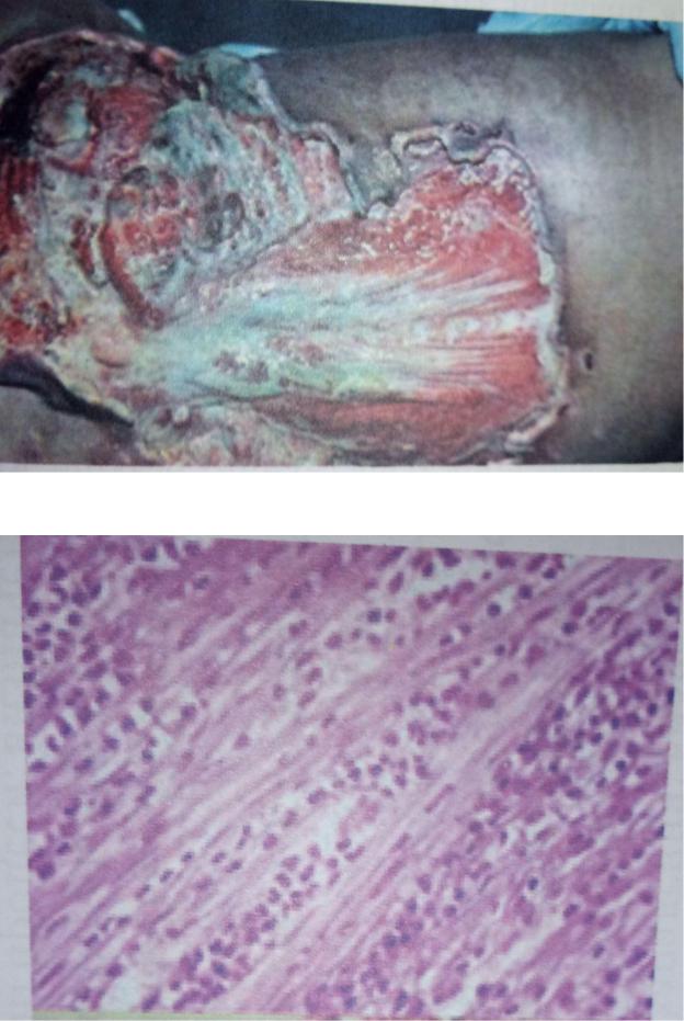 Макропрепарат: видалена некротизована шкіра і підшкірна клітковина, залишки гнійних мас на відкритих м’язах.
