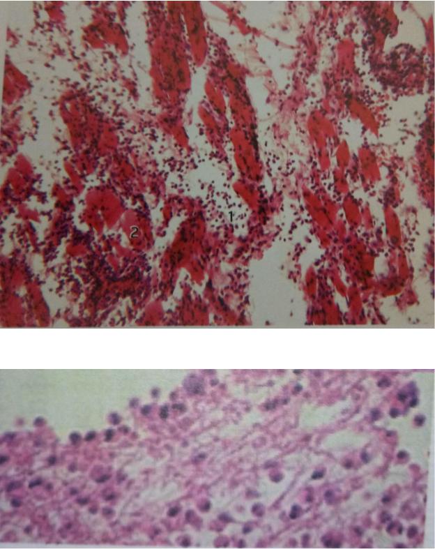 Мікропрепарат флегмона скелетного м’яза: дифузна масивна лейкоцитарна іфільтрація сполучної тканини(1).фрагменти м’язових волокон подекуди некротизовані(2).