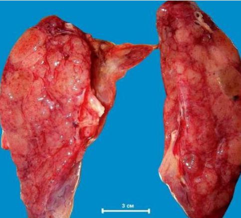 Розміри і маса щитовидної залози частіше збільшені, поверхня горбиста, з декількома вузлами різної величини, щыльноеластичноъ консистенціъ, капсула былувата, на розрізі (2-ий мал.) представлена конгломератом вузлів різного розміру, жовтувато-коричневого кольору, зернистого вигляду, з білими прошарками і рубцями, вогнищами крововиливів, гемосидерозу.