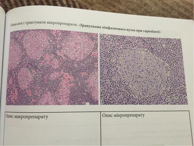 Мікропрепарат: забарвлення – гематоксилін, еозин; проліферативне гранулематозне запалення; неспецифічна неказеозна лімфо епітеліальна гранульома, що має морфологію епітеліоїдноклітинної гранульоми з гігантськими клітинами Пирогова-Лангханса. Вогнища некрозу відсутні. По периферії гранульоми – вал із лімфоцитів.