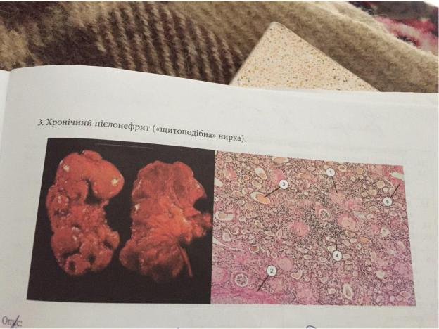 Макропрепарат: нирки зменшені в розмірах, в’ялі, з дрібнозернистою поверхнею, повнокровними судинами, капсула відділяється важко. Слизова оболонка чашечок і лоханок потовщена, містить каламутну сечу і дрібні камені.
