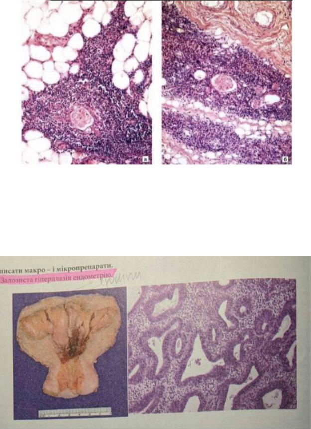 Мікропрепарат: Ендометрій потовщений за рахунок гіперплазії залоз і проліферації клітин строми. Кількість залоз збільшена, вони звиті, деякі мають пилкоподібний, штопороподібний вид, кістозно розширені;