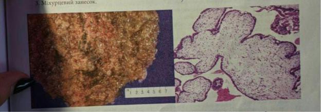 Мікропрепарат: Різкий набряк ворсин з утворенням у центрі цистерн, заповнених рідиною. Ступінь проліферації трофобласта може бути різна.