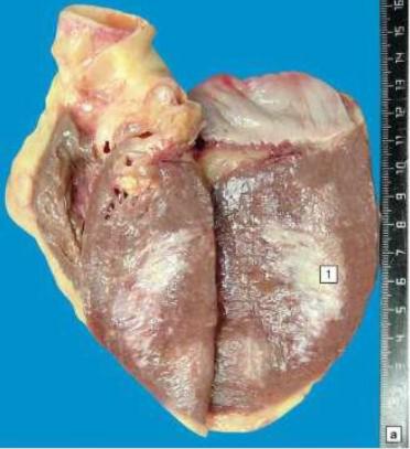 Макропрепарат: Постінфарктний кардіосклероз .Розмір та маса збільшені, потовщені стінки, збільшений об'єм сосочкових і трабекулярних м'язів лівого шлуночка, розширені порожнини серця, міокард в'ялої консистенції, глинистого виду на розрізі (ексцентрична гіпертрофія міокарда) .В стінці лівого шлуночка -великий