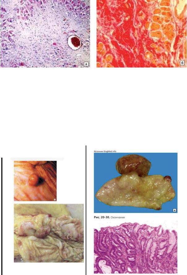 В міокарді -великий вогнище рубцевої (зрілої сполучної) тканини .Со слабо вираженою лімфомакрофагальной інфільтрацією, невеликим числом сидерофагів, повнокровними судинами.Виражена гіпертрофія перифокально розташованих кардіоміцитів При фарбуванні по Ван-Гизону сполучна тканина пофарбовані в червоний колір, кардіоміоцити -в жовтий; б- забарвлення пикрофуксином по Ван-Гизону