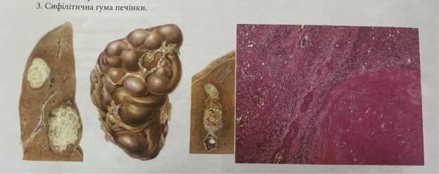 Наслідки: У печінці , на початку гострої фази , вони можуть симулювати нодулярну гіпертрофію . Але пізніше , після рубцювання , в печінці виникає сифілітичний цироз. З часом некротичні маси гум підлягають рубцюванню, іноді обважнюються.