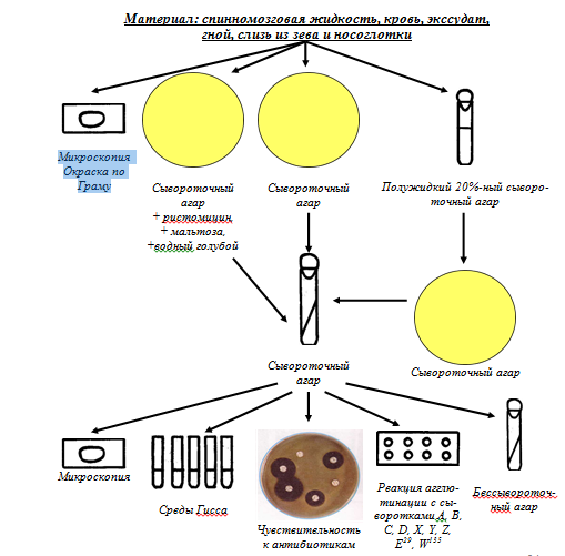Материал : спинномозговая жидкость , кровь, экссудат, гной, слизь из зева и носоглотки.