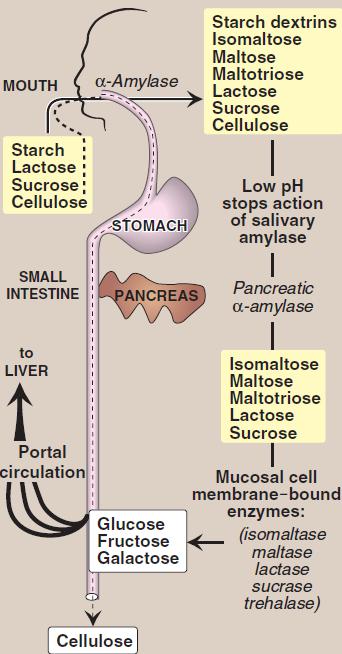 Пищевые дисахариды (лактоза и сахароза), а также продукты переваривания крахмала превращаются в моносахариды с помощью гликозидаз, секретируемых клетками слизистой оболочки кишечника и прикрепленных к мембранам абсорбирующих клеток.