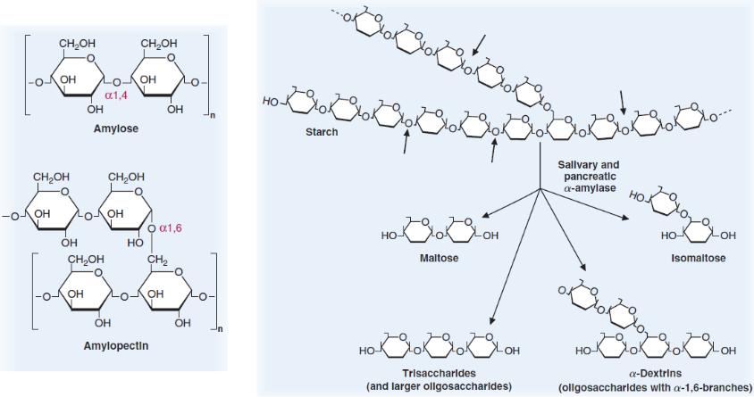 В соке поджелудочной железы содержится α-амилаза, расщепляющая α-1,4 связи в крахмале, образуя дисахарид мальтозу, изомальтозу (в небольшом количестве), трисахарид мальтотриозу и олигосахариды (декстрины).