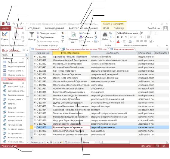 Программа Microsoft Access 2013 имеет строку вкладок, содержащую доступные в приложении команды, распределенные по категориям.