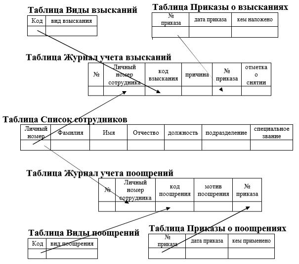 Еще одним недостатком исходных таблиц является необходимость ручного ввода видов взысканий и поощрений, что усложняет контроль за корректностью ввода этих данных, поскольку все виды взысканий и поощрений закреплены нормативно-правовым документом. В этом случае целесообразно выделить эти виды в отдельные таблицы (Таблица 2, Таблица 3).