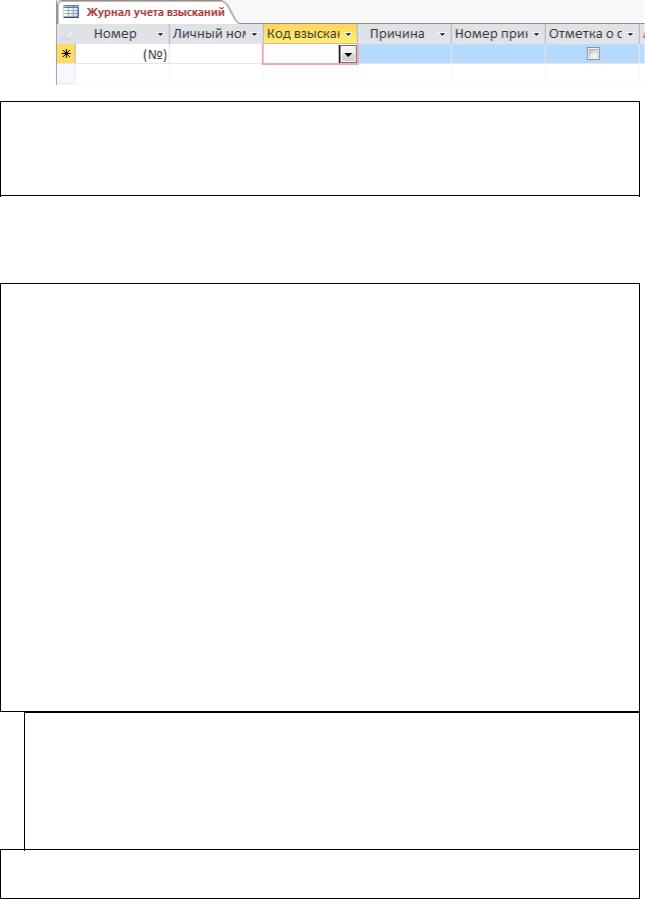 13.Откройте таблицу Журнал учета взысканий. Если подстановка была создана корректно, то при помещении курсора в поде Код взыскания появится выпадающий список (Рисунок 6).
