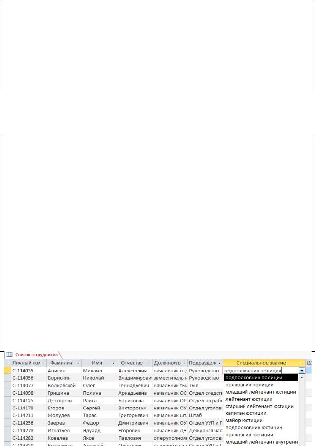 поместите курсор в поле Специальное звание. Если список был настроен правильно, то он автоматически раскроется и будет содержать новые значения (Рисунок 7).