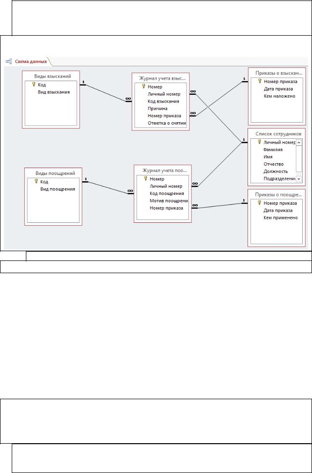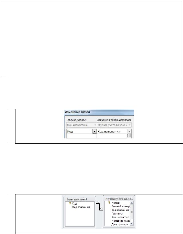 5.Создайте связь между таблицами Виды взысканий и Журнал учета взысканий с обеспечением целостности данных по однотипным полям.