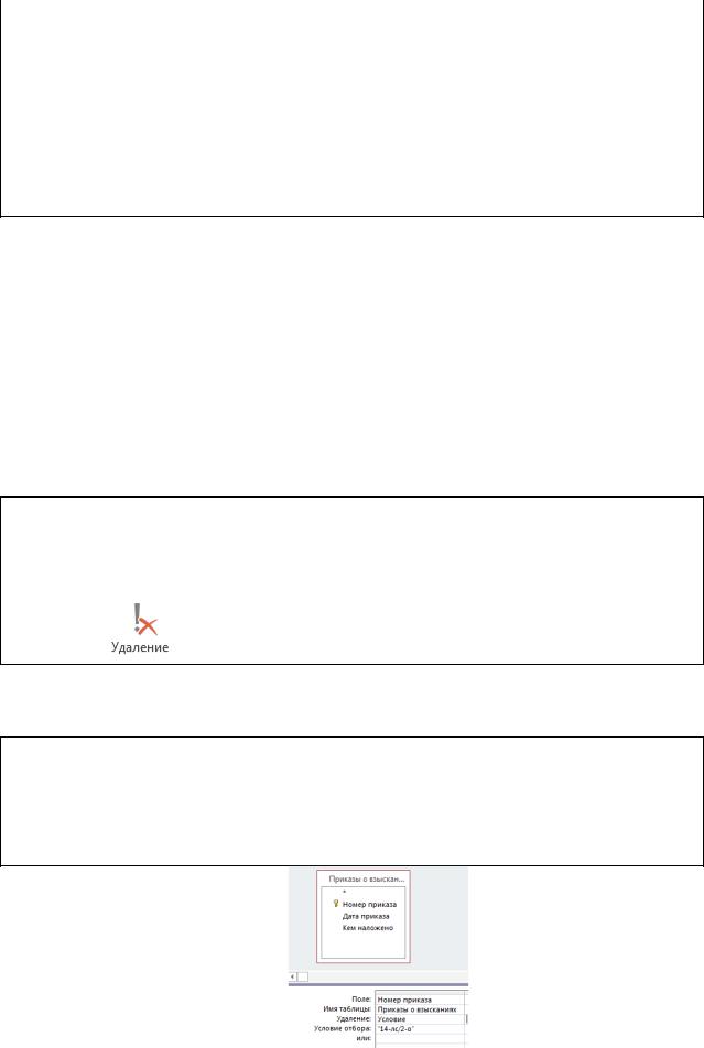 Предположим, что приказ начальника отдела №14-лс от 02.02.2012 был признан незаконным. Сведения об этом приказе подлежат удалению из базы данных. Можно удалить эти сведения непосредственно из таблицы, но с точки зрения эксплуатации базы данных, более правильным решением будет использование запроса.