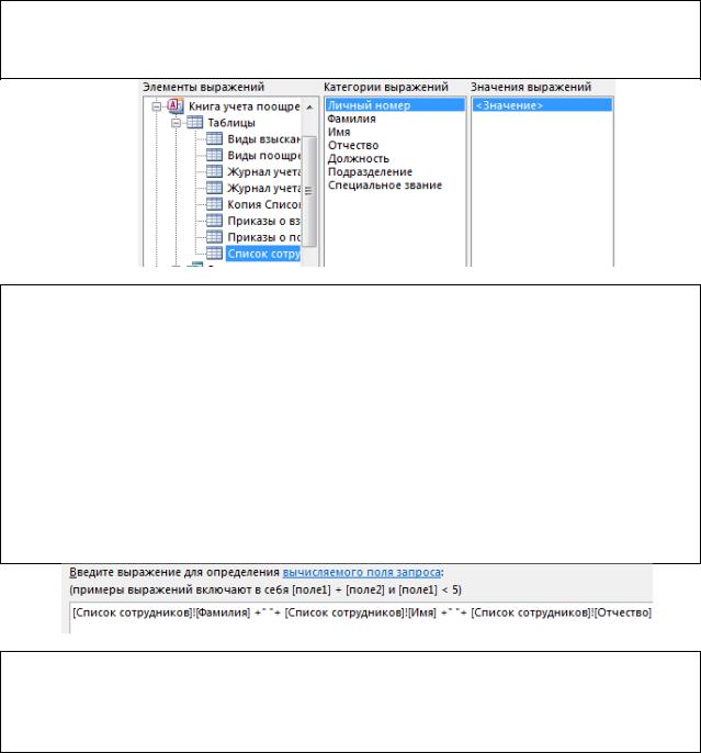 5. Раскройте список Книга учета поощрений в группе Элементы выражений, раскройте список Таблицы и выберите таблицу Список со-