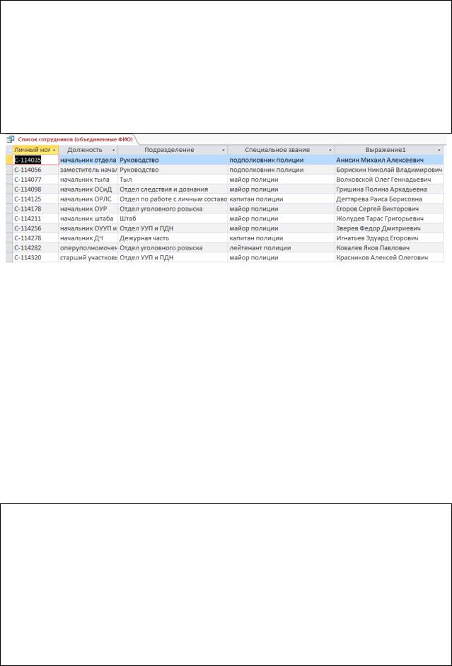 При создании таблицы Список сотрудников (Таблица 1), мы разбили графу ФИО сотрудника на три поля: Фамилия, Имя и Отчество. С точки зрения проектирования базы данных наше решение было вполне оправданно, но исходная задача предполагает запись ФИО в одну графу. Создадим запрос, который будет объединять данные из трех полей в одно новое поле. Хранение значений этого поля в таблице не предусмотрено.