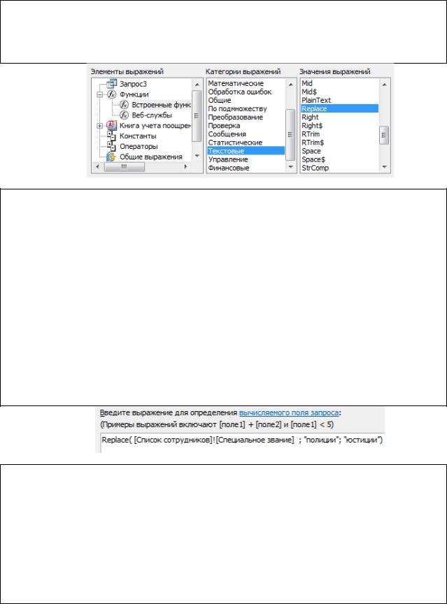 При импорте таблицы Список сотрудников, все сотрудники получили специальные звания полиции, однако, проходящие службу в подразделениях следствия и дознания имеют специальные звания юстиции. Таким образом, необходимо организовать запрос на обновление, который бы отбирал из таблицы Список сотрудников сотрудников отдела следствия и дознания, а затем менял бы в поле специальное звание слово «полиции» на слово «юстиции».
