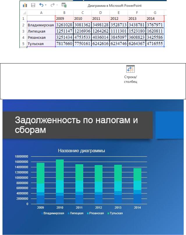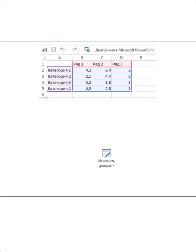 Для редактирования данных диаграммы PowerPoint использует среду табличного процессора Excel. Данные, на основе которых строится диаграмма, обведены прямоугольником с синим контуром. Изменение размера этого прямоугольника меняет количество данных для построения диаграммы.