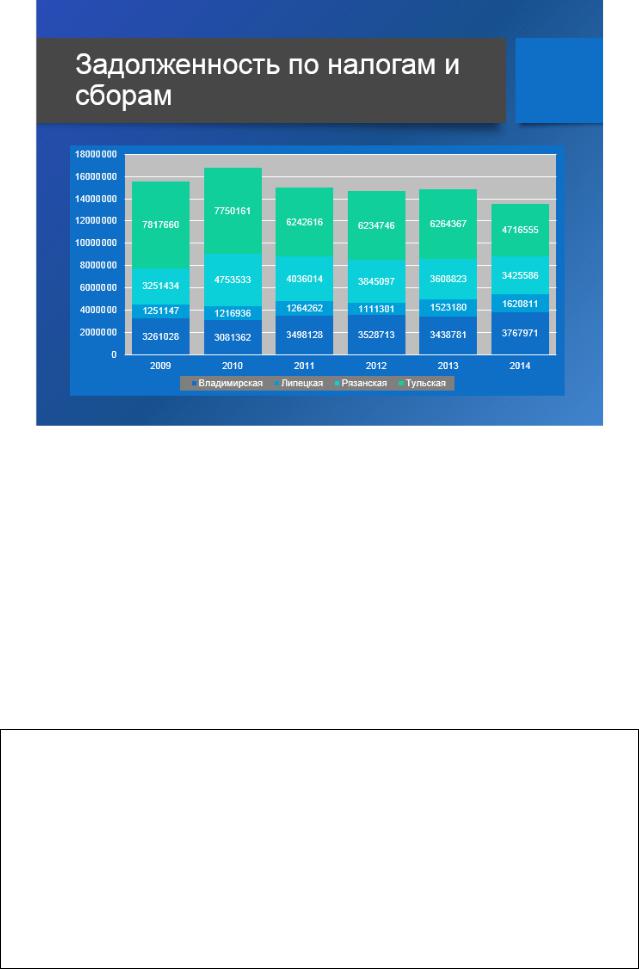 Следующий слайд презентации демонстрирует динамику задолженности по налогам и сборам. За основу взяты данные, представленные в таблице 2.