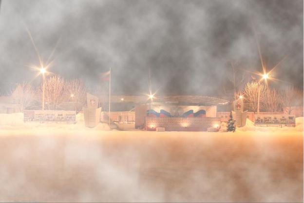 11.Активизируйте слой Градиент. Выберите инструмент Кисть и установите ее параметры: размер – примерно 80 пикселей, жесткость – порядка 50%, режим – нормальный, непрозрачность – 100%. Изобразите несколько изогнутых линий на фоне плаца – участки сгущения тумана. Последовательно выделяя небольшие участки нарисованных линий, примените к ним фильтр Скручивание из группы Искажение. Величину угла установите экспериментально по своему усмотрению.