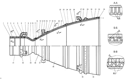 1 - кольцо цилиндра; 2 - оболочка (оболочка 1 блока); 3 - рубашка цилиндра; 4 - кольцо завесы; 5 - патрубок; 6 - соединительное кольцо; 7 - кольцо; 8 - оболочка (оболочка 2 блока); 9 - докритическое кольцо; 10 - наружное критическое кольцо; 11 - соединительное кольцо; 12 - кольцо; 13 - внутренняя оболочка; 14 - наружная оболочка; 15 - патрубок; 16 - кольцо; 17 - соединительное кольцо; 18 - кольцо; 19 - внутренняя оболочка; 20 - наружная оболочка; 21 - гофр; 22 - кольцо; 23 - соединительное кольцо; 24 - кольцо; 25 - гофр; 26 - наружная оболочка; 27 - патрубок; 28 - кольцо коллектора; 29 - кольцо защиты; 30 - наружная оболочка; 31 - внутренняя оболочка; 32 - наружное; 33 - нижнее кольцо; 34 - третья секция; 35 - нижний коллектор; 36 - вторая секция; 37 - средний коллектор; 38 - первая секция; 39 - средняя часть (2 блок); 40 - верхний коллектор; 41 - средняя часть (1 блок)