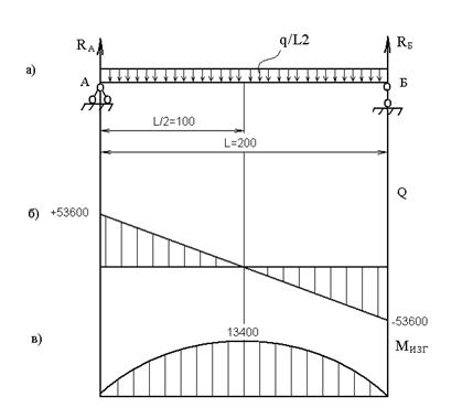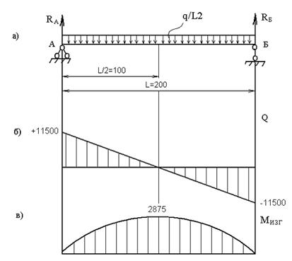 а) - силы действующие на раму; б) - эпюра поперечных сил;в) - эпюра изгибающего момента в середине пролета.