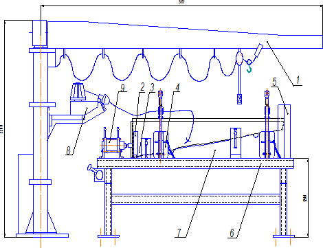 Консольно-поворотным краном, позиция 1 (см. рисунок 3.1.5), устанавливаются в приспособлении на упоры, позиция 7, две лыжи. Лыжи прижимаются к упорам, установленными между ними, винтовыми прижимами, позиция 3. Далее по упору, позиция 2, между лыжами устанавливается ребро. После того как, лыжи и ребро установлены они прижимаются пневмоприжимом, позиция 9, к упорам, позиции 2 и 5. Затем производится прихватка ребра к лыжам.