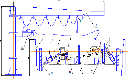 Консольно-поворотным краном, позиция 1, устанавливается на раму кантователя, позиция 11, второй узел. Правильность установки второго узла обеспечивается упорами, позиция 10. Затем на установленный второй узел устанавливается первый узел. Правильность установки этого узла обеспечивается пазами во втором узле под детали гнездо первого узла. После того как узел установлен он прижимается винтовыми прижимами, позиции 7 и 9, к нижнему узлу. Так же собранное изделие поджимается боковыми откидывающимися упорами, позиции 4 и 6, закрепленный на штоке пневмоприжимов, позиция 3.