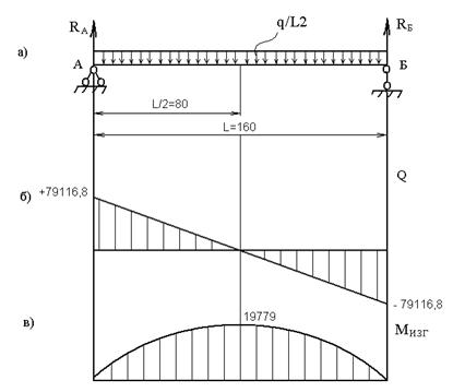а) - силы действующие на раму; б) - эпюра поперечных сил; в) - эпюра изгибающего момента в середине пролета.