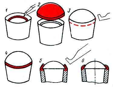 Ажурные объемные изделия могут быть изготовлены и методом выколачивания. Если набранная филигрань хорошо пропаяна, она легко поддается выколотке и ей может быть придана любая форма. Объемная форма делается из нескольких или даже двух частей, которые затем спаиваются между собой. При этом нужно учитывать, однако, что какие-то детали при выколотке вытягиваются и возникает искажение. Чтобы избежать этого, нужно уже при разработке рисунка давать необходимые припуски. К крупным объемным филигранным вещам с внутренней стороны при пайке для прочности припаивают каркас или же отдельно спаивают части изделия и затем монтируют и припаивают к каркасу.