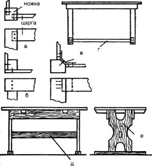 Простой столярный стол: а - способ крепления ножек стола; б - крепление царги к ножкам; в - использование стальной накладки; г - нижняя связка; д - средняя связка; е - пример изготовления фигурной боковины стола