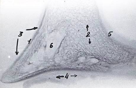 - компактное вещество, 2 - губчатое вещество, 3 - дорсальная стенка, 4 -