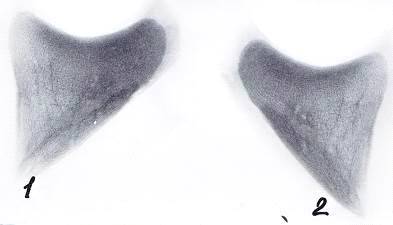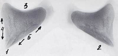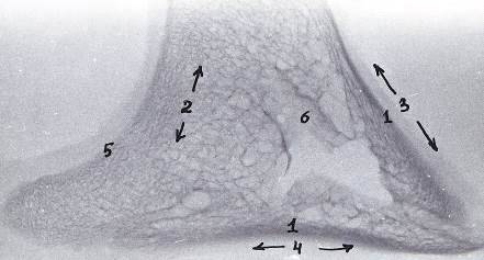 У телят 30-суточного возраста в копытцевых костях на рентгенограммах отмечается ориентация костных трабекул губчатого вещества под субхондральной костью. Контур дорсальной стенки едва различим и имеет рентгеноплотность ниже, чем подошвенная (рис.13). Слоистое строение компактного слоя подошвы занимает первые 2/3 части всей ее длины. На дорсальной стенке компактное вещество сетчатой структуры и пониженной рентгенплотности в нижней части кости. Губчатое вещество в центре кости разряжено, без четкой ориентации костных трабекул (рис.14).