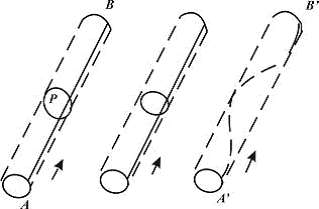 Притяжением вакансий к винтовой дислокации объясняют образование геликоидальных дислокаций, у которых линия дислокации закручена в весьма правильную спираль. Природа образования геликоидальной дислокации окончательно не выяснена. Геометрия превращения прямолинейной винтовой дислокации AB в геликоидальную A’B’ вследствие присоединения группы вакансий P показана на рис. 3.1.