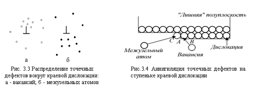 Вакансии и межузельные атомы, притянувшись к дислокации, могут аннигилировать на порогах. Результат взаимодействия краевой дислокации с примесными атомами принципиально отличен от результата ее взаимодействия с вакансиями и межузельными атомами основного металла. Если последние могут аннигилировать, то примесные атомы сохраняют свою индивидуальность, образуя атмосферы.