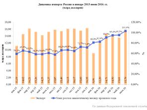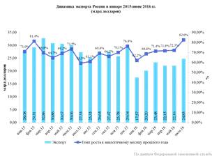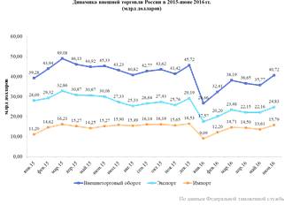 По итогам первого полугодия стоимостной объем экспорта России снизился на 28,7% по сравнению с январем-июне 2015 года и составил 130,4 млрд долларов. Главным фактором, оказавшим влияние на динамику экспорта, стал уровень цен на сырую нефть. Из-за избытка предложения на мировом рынке, а также сокращения спроса со стороны Китая в январе цены на нефть марки Brent рухнули до рекордного минимума в 28 долларов за баррель, что также сказалось и на нефти марки Urals, а также других углеводородах, которые поставляет Россия. Однако уже в феврале на мировом рынке нефти наметился перелом: крупнейшие экспортеры нефти - Канада, Венесуэла, Ливия, Нигерия и другие были вынуждены сократить объемы поставок. Россия, в свою очередь, продолжила наращивать добычу и экспорт, несмотря на то, что уровень цен по-прежнему оставался низким и так и не достиг прошлогоднего уровня. Физический объем экспорта вырос на 5,2% по сравнению с январем-июнем 2015 года, а стоимостной упал на 31,5% до 32,93%.
