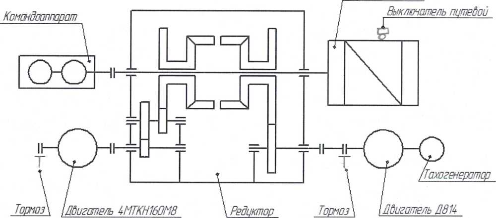 Чтобы обеспечить требуемый диапазон и точность для поддержания этой скорости фурмы, тахогенератор постоянного тока TP212 установлен на заднем конце вала двигателя. Возбуждение тахогенератора постоянными магнитами. Кинематическая схема механизма подъёма измерительной фурмы представлена на рисунке 1.3.